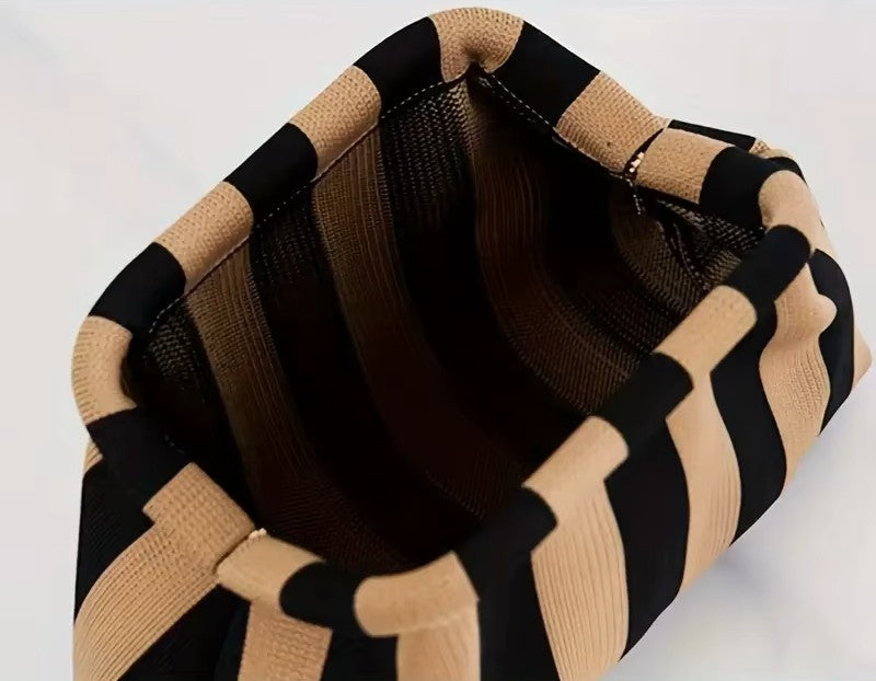 The Bella's large hemmed opening conceals a rugged frame that opens and shuts with a satisfying "clap!" and stays in position, giving the bag a basket-like shape when open, and keeping its contents secure when closed. The thick and densely double-knit fabric is sturdy enough to hold its shape, and comes in a range of bold awning stripes.